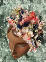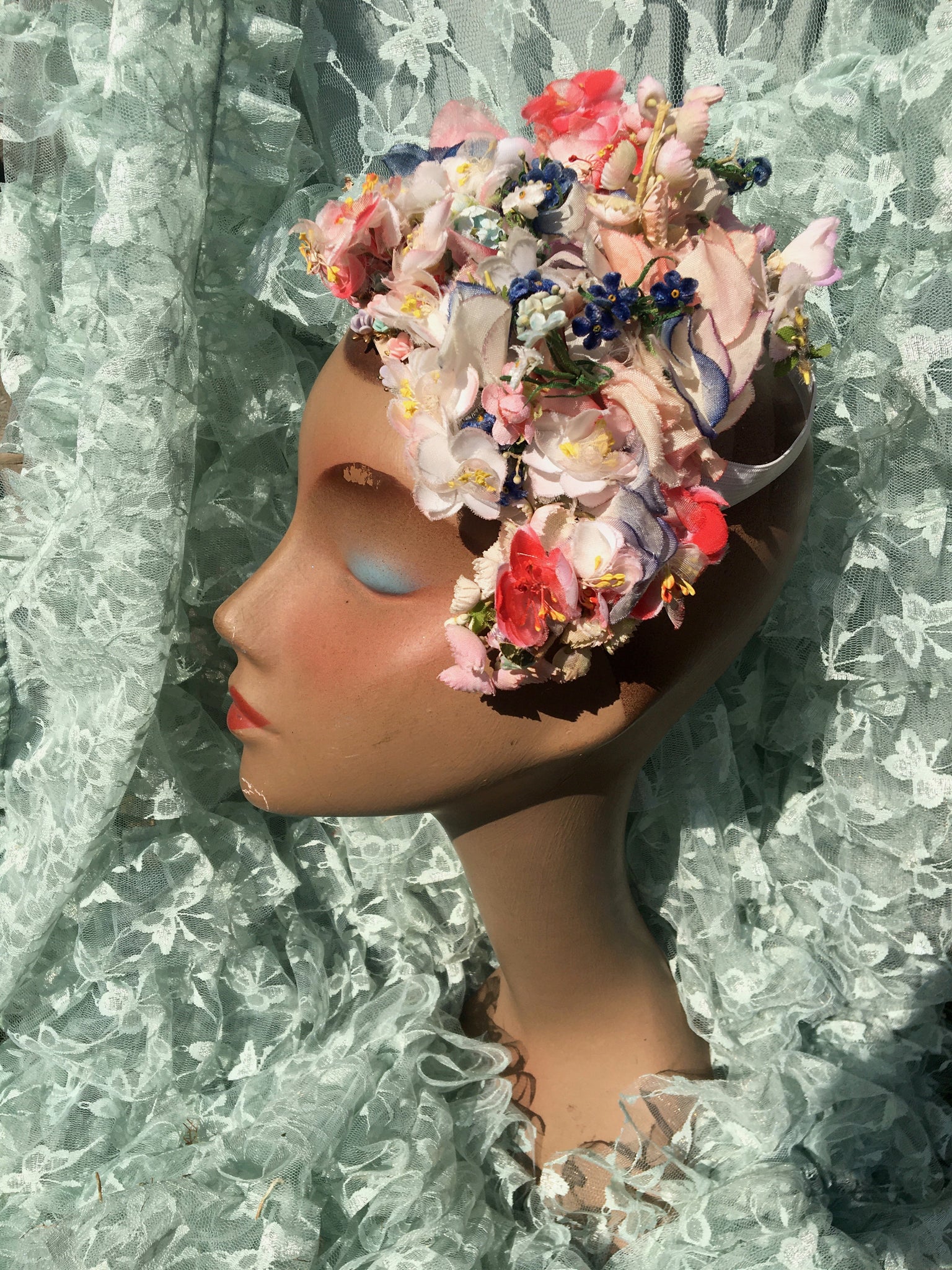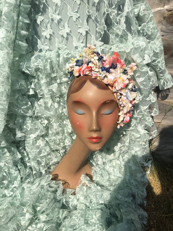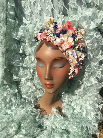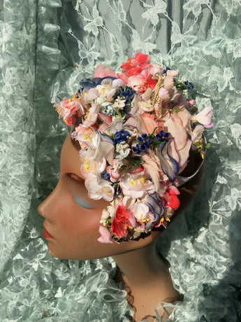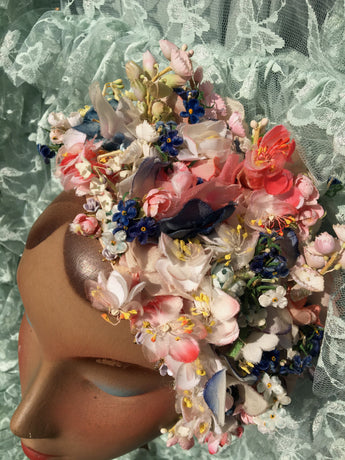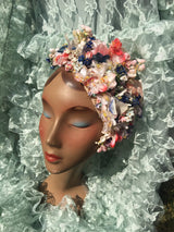 Stunning authentic vintage silk flowers and integrated jewels attached to a felt base. Can be work either way round and anywhere on the head.