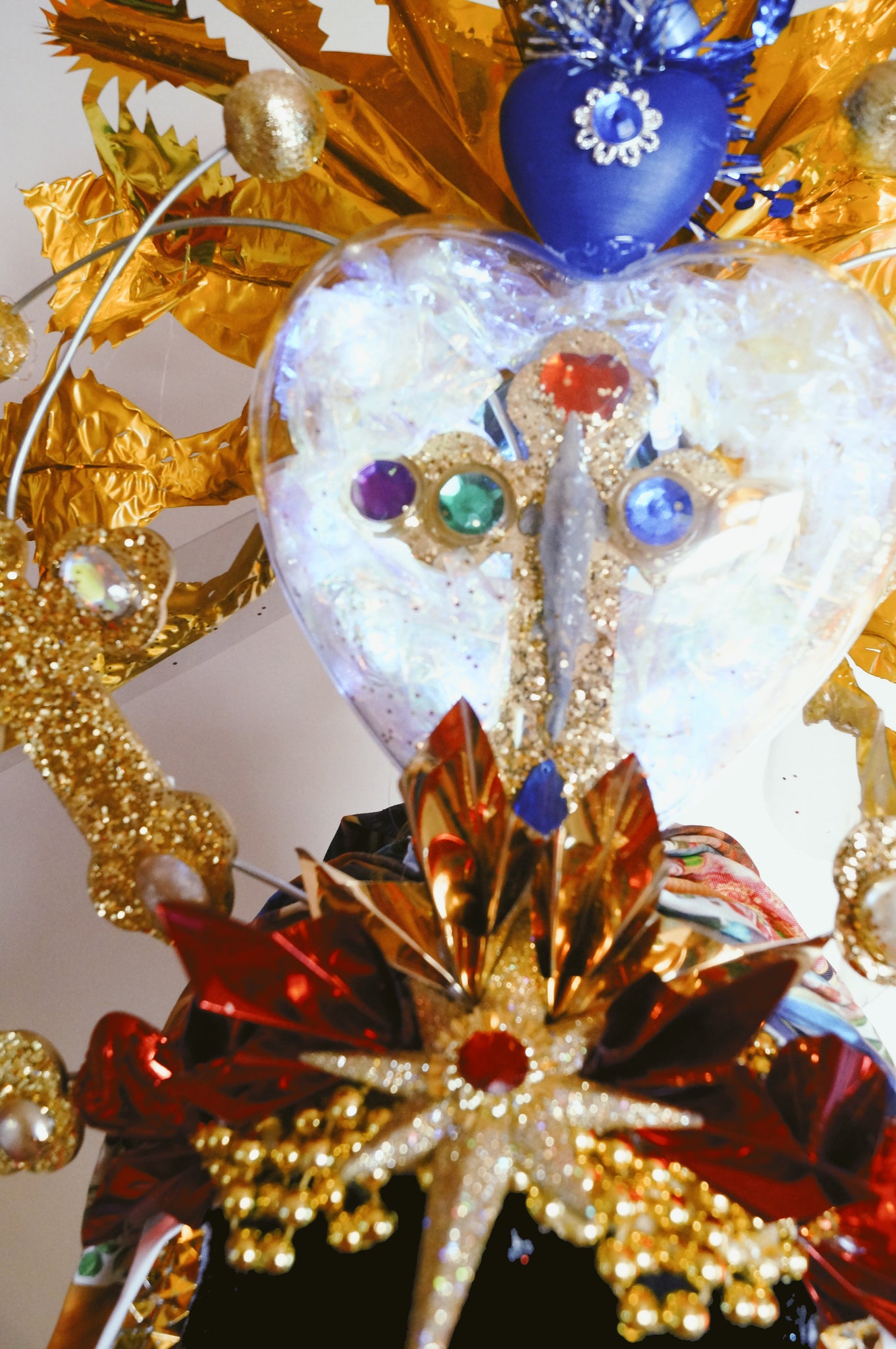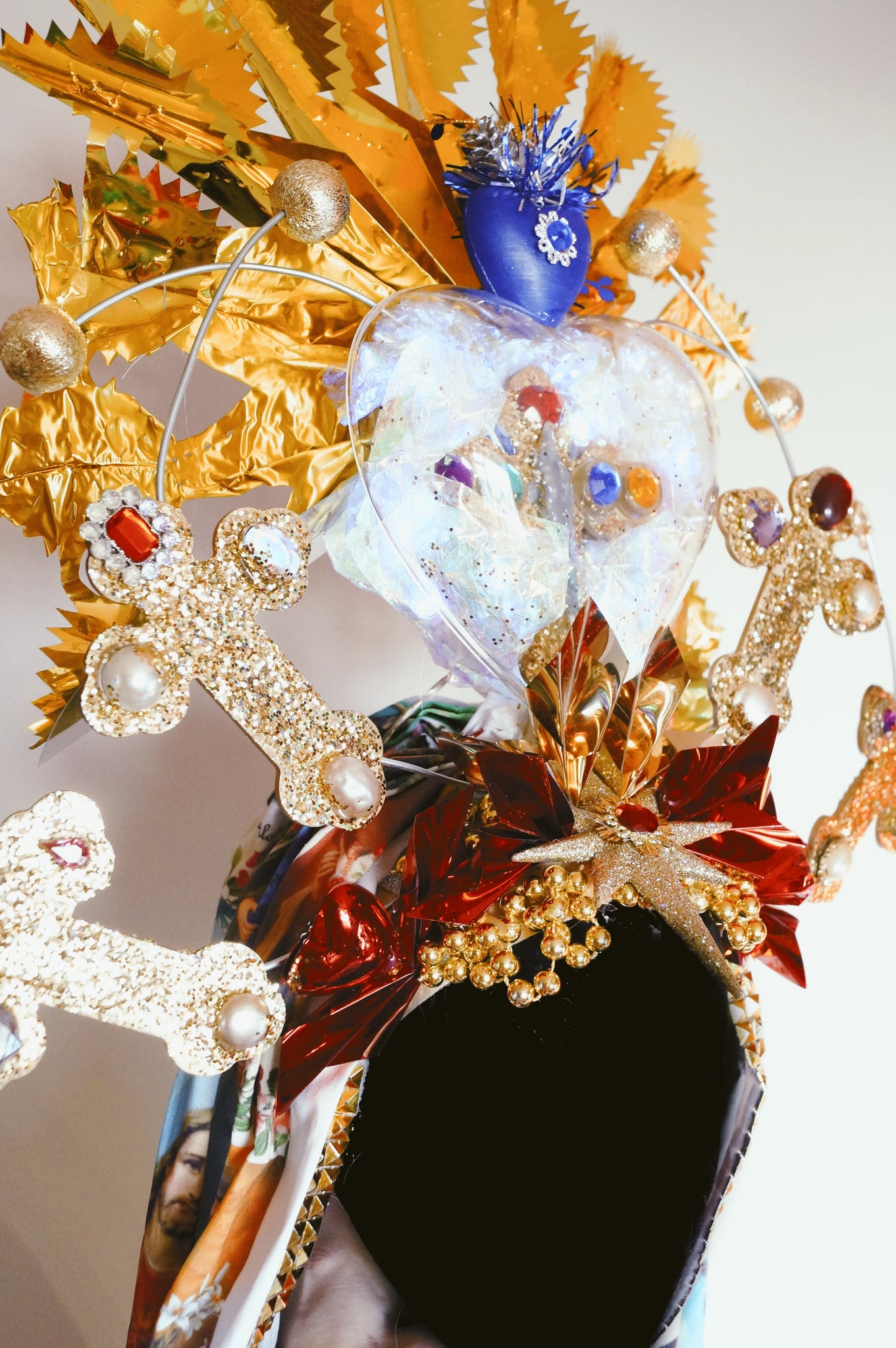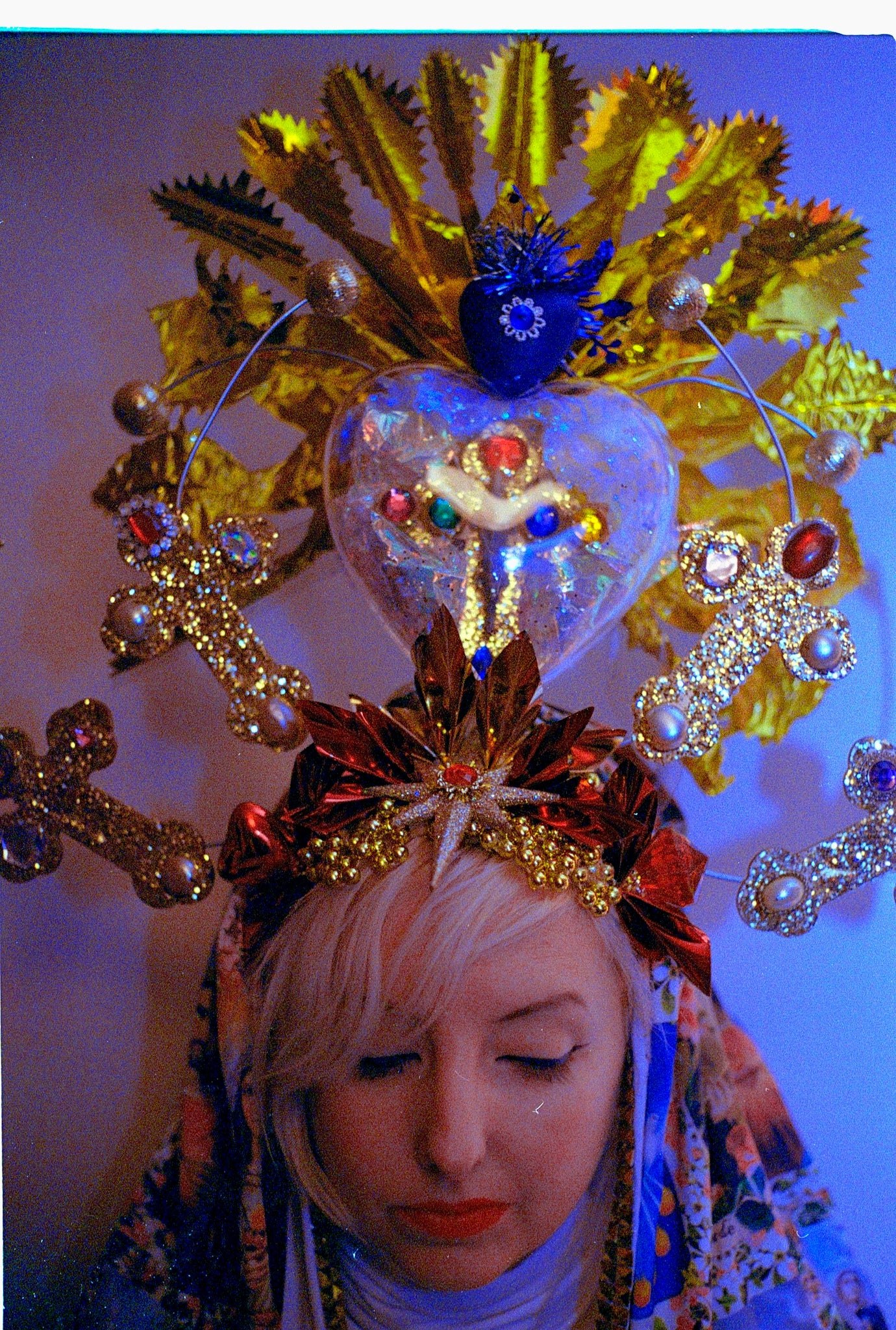 virgin Mary headdress with glittered wooden crosses, giant plastic iridescent heart centrepiece with led battery operated lights and bespoke religious imagery veil.