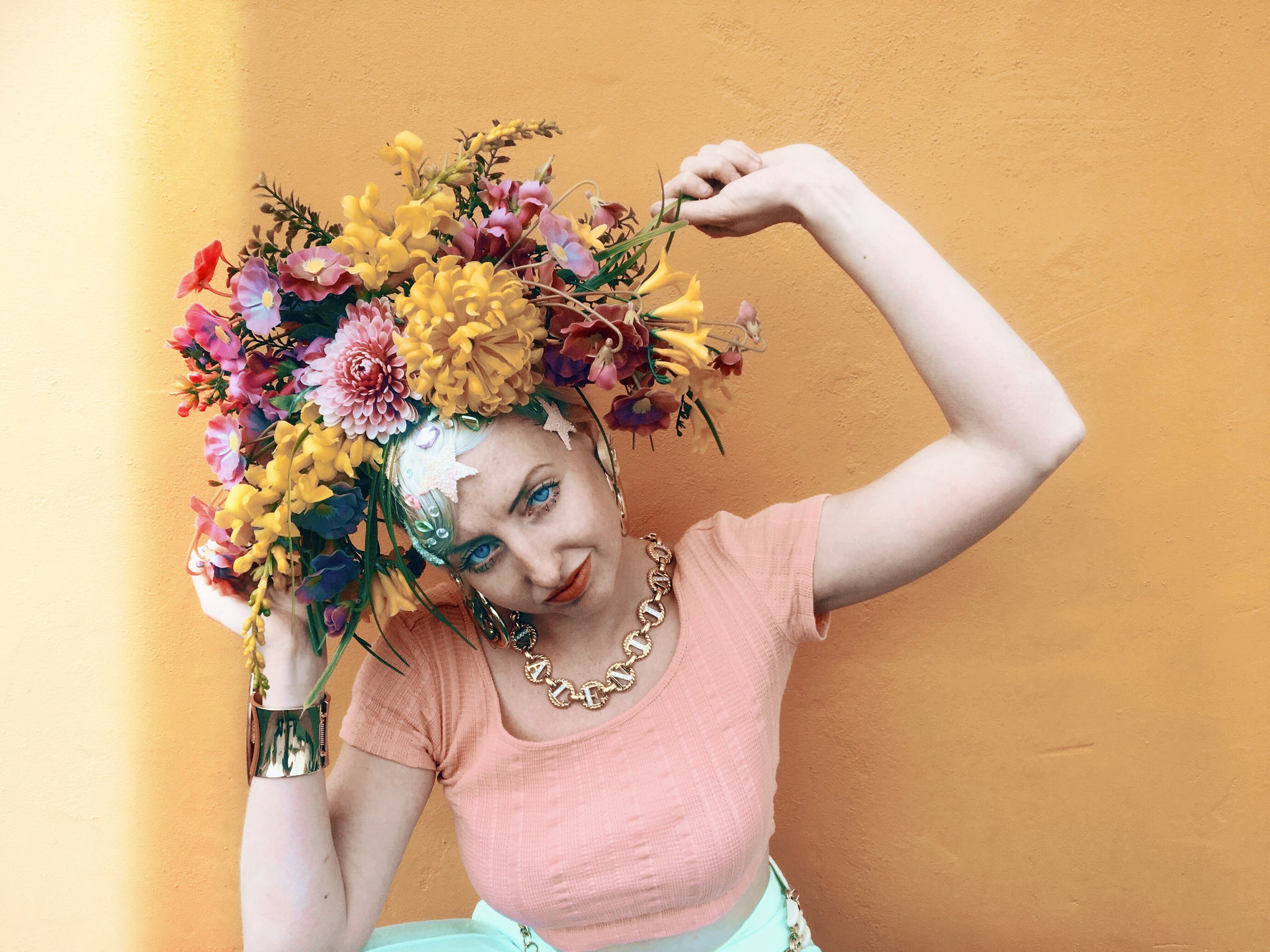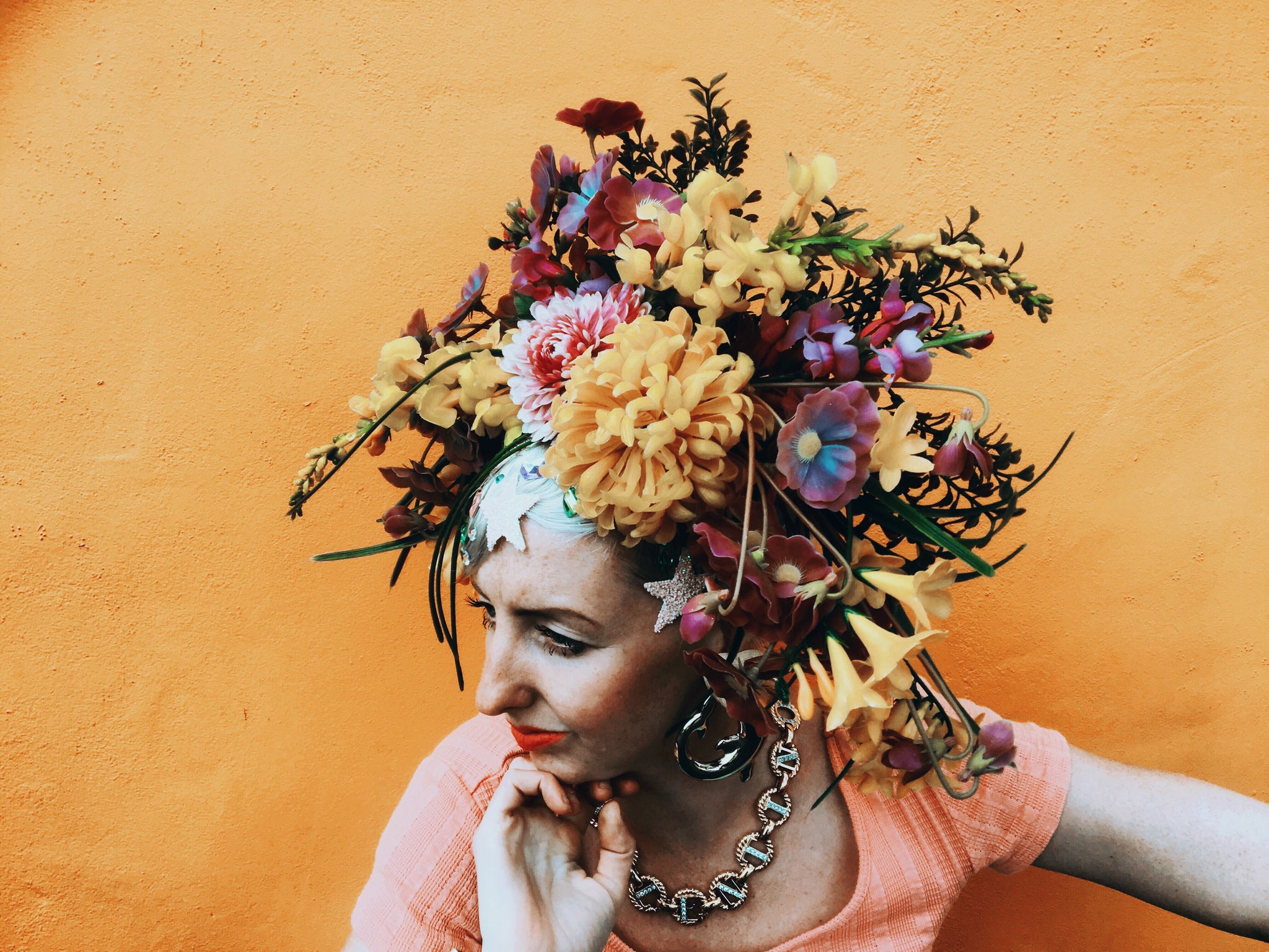 Big wild flower headdress made from an array of vintage plastic flowers.