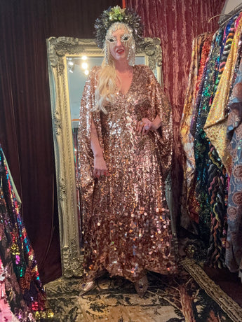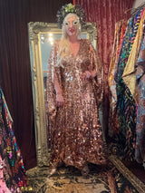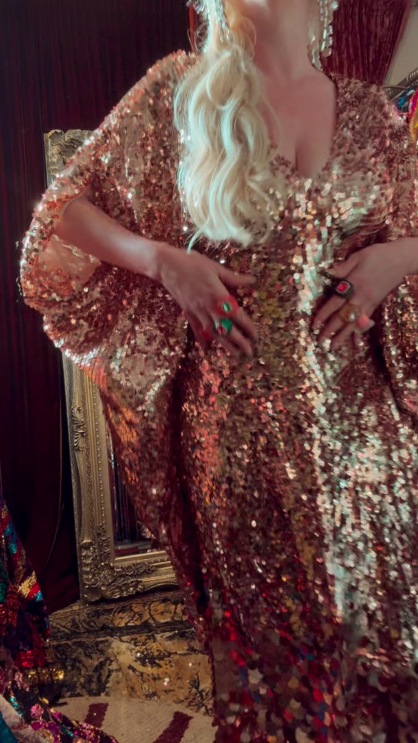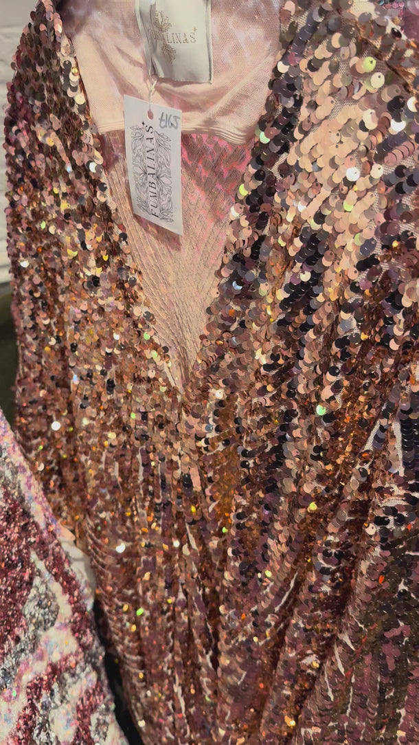 XMAS 25 OFF THE RAILS - chunky gold sequin mix - patterned lots of stretch v-neck maxi