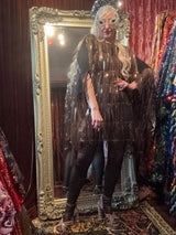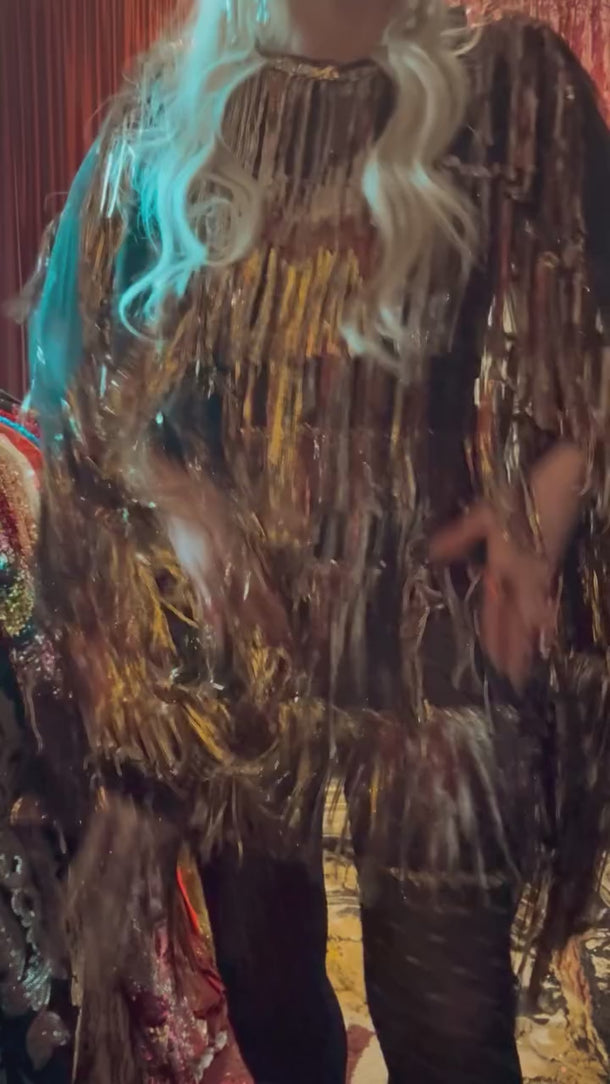 Sequin round neck with front and back ribbons, tapered sides and side split. May be some flaws as a sample piece