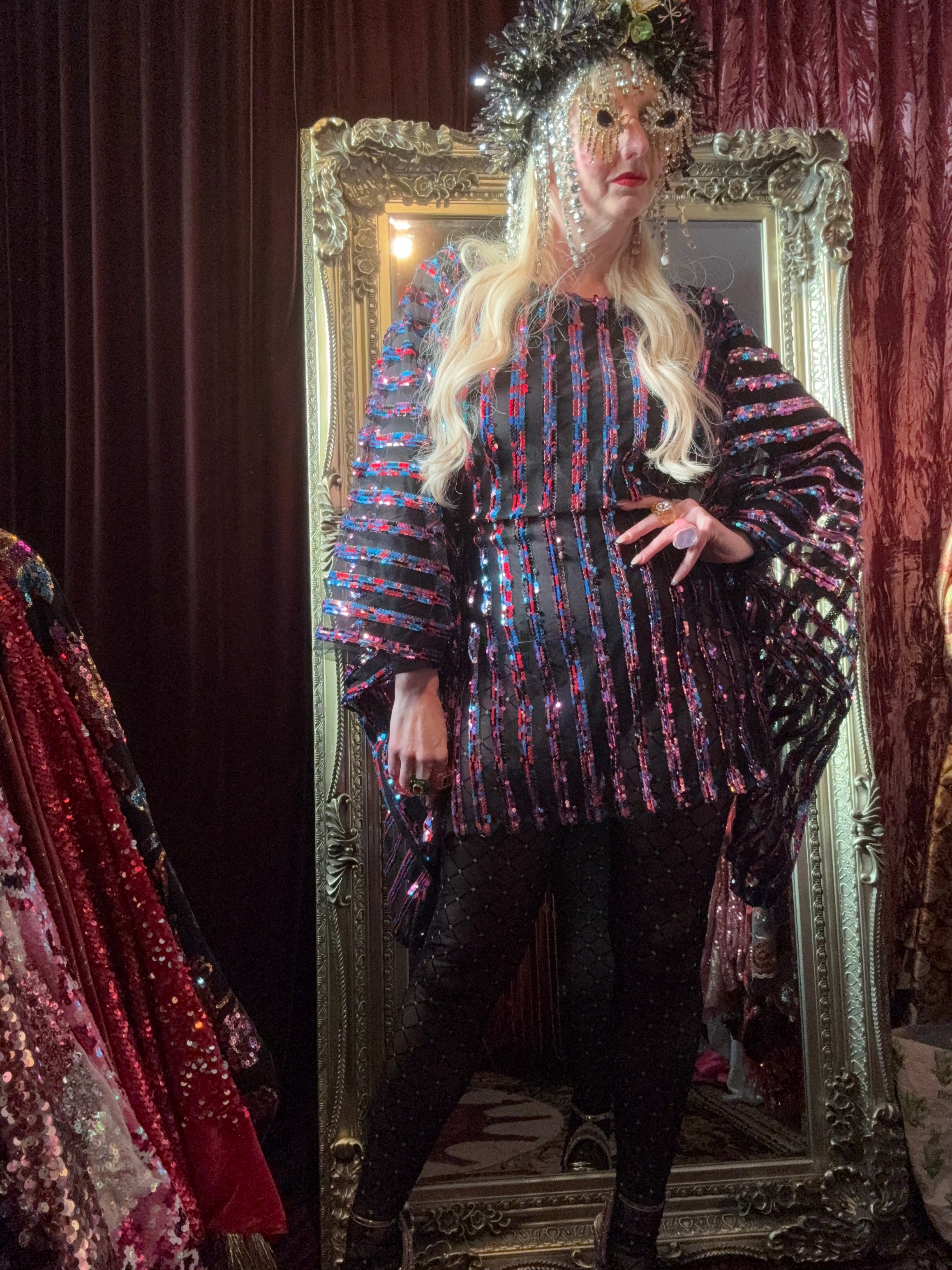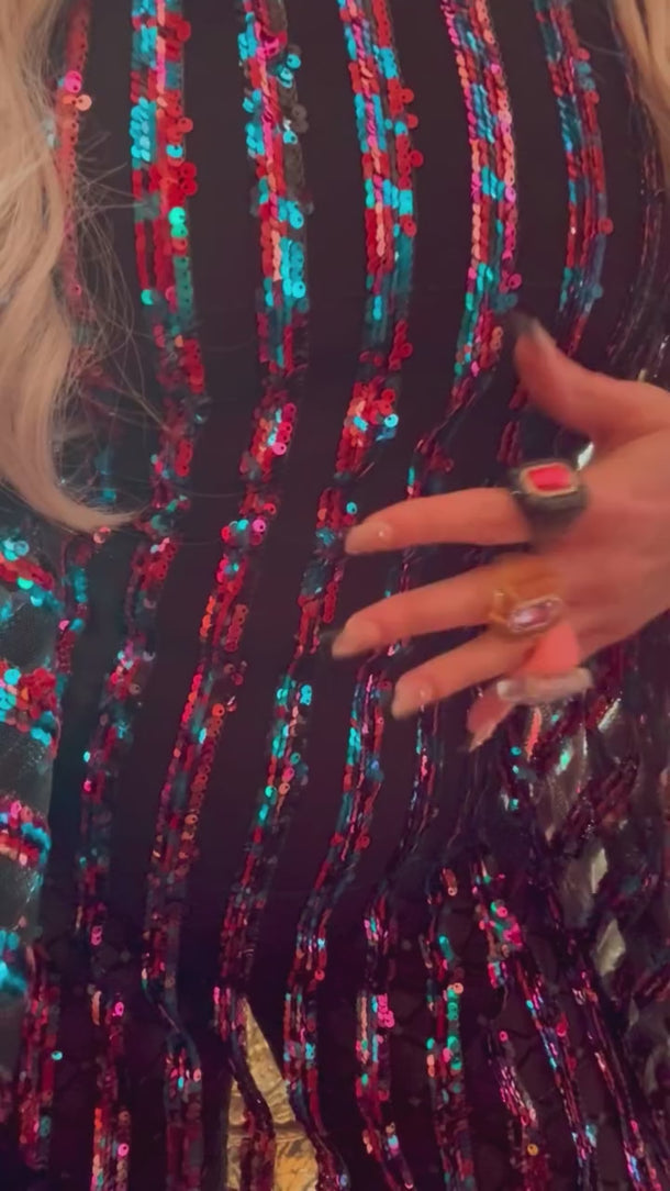 Sequin round neck with front and back ribbons, tapered sides and side split. May be some flaws as a sample piece