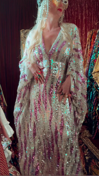 Our kaftan dresses are uniquely fitted with hidden velvet ribbons inside, meaning YOU decide how you'd like to wear them. Choose from -